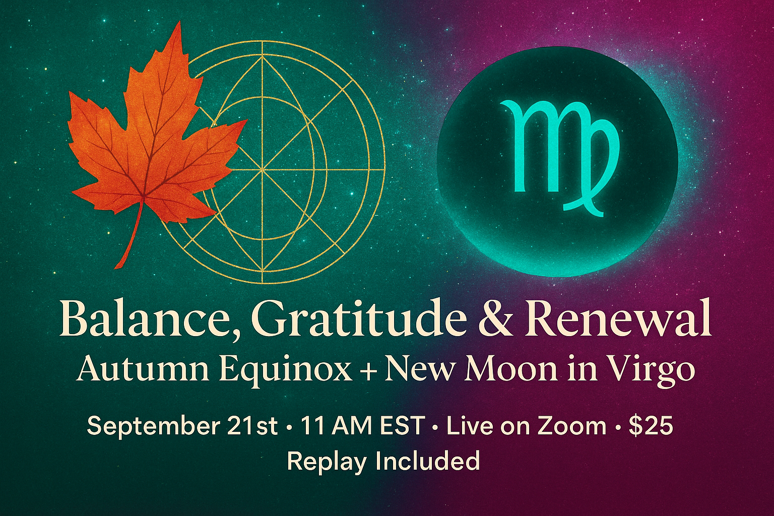 Step into a sacred space on the day the Earth comes into perfect balance between light and dark. This 60–90 minute online healing and activation experience is designed to align your energy with the powerful currents of the Autumn Equinox, New Moon in Virgo, and Mabon.